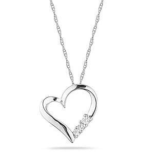 .You can choose to buy a product and A classic heart pendant receives a bit sparkle with all the 10k White Gold 3-Stone Diamond Heart Pendant. Resting over a dainty and elegant twisted rope chain is often a open heart shaped pendant that gleams under any light with its brilliant white-gold shine. Along underneath right side of the pendant are three natural round diamonds that show off their good-cut in their prong setting. The three diamonds make-up 1/10 cttw. This timeless pendant makes an excellent gift for all occasions.